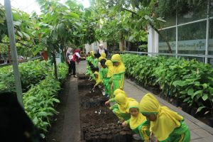 Perjalanan belajar anak dimulai di area Tani Modern, tempat mereka diperkenalkan dengan berbagai jenis tanaman termasuk tanaman kakao yang menjadi ikon utama Kampung Coklat. Para pemandu menjelaskan bahwa cokelat yang sering mereka nikmati berasal dari buah kakao yang melalui proses panjang sebelum dapat diolah menjadi makanan manis favorit anak-anak. Anak-anak dengan penuh rasa ingin tahu mengamati proses pembibitan kakao, mulai dari cara memilih benih unggul hingga teknik menanam bibit agar tumbuh dengan baik. Mereka diperlihatkan bentuk daun dan batang tanaman kakao, lalu diajak mengenali berbagai jenis buah kakao berdasarkan warna dan ukuran. Salah satu momen yang paling menarik adalah ketika pemandu memetik buah kakao matang untuk ditunjukkan kepada anak-anak. Dengan mata berbinar, mereka menyaksikan bagaimana buah tersebut dibelah untuk memperlihatkan biji-biji kakao yang dilapisi daging buah berwarna putih. Banyak dari mereka baru pertama kali melihat langsung bagian dalam buah kakao. Kegiatan ini menjadi pengalaman visual dan sensorik yang kuat, sebab anak-anak tidak hanya mendengar penjelasan tetapi juga melihat, menyentuh, bahkan mencium aroma buah kakao. Pada tahap Memahami ini, anak-anak belajar tentang asal-usul cokelat, memahami bentuk tanaman kakao, proses pembibitan, hingga bagaimana buah kakao dipetik dari pohonnya.