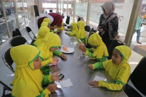 Setelah serangkaian aktivitas yang padat, anak-anak diajak menuju ruang terbuka untuk melakukan kegiatan Merefleksi, tahap ketiga dari Pembelajaran Mendalam. Dalam sesi ini, mereka duduk melingkar bersama guru dan pemandu untuk mengingat kembali apa saja yang telah mereka pelajari sepanjang hari. Guru memandu mereka dengan pertanyaan sederhana seperti: “Bagaimana bentuk buah kakao?”, “Apa yang paling kalian sukai dari kegiatan hari ini?”, atau “Bagaimana proses cokelat dibuat?” Melalui refleksi ini, anak-anak berusaha menghubungkan pengalaman visual dan praktik langsung dengan pemahaman yang mereka bangun sejak tahap pertama. Mereka belajar bahwa cokelat yang sering mereka makan melewati proses panjang mulai dari pembibitan kakao, perawatan tanaman, pemanenan, fermentasi biji, pengeringan, pengolahan di pabrik, hingga akhirnya menjadi produk siap konsumsi. Pada momen ini, anak-anak juga belajar tentang pentingnya menghargai makanan serta memahami bahwa di balik setiap makanan yang mereka nikmati terdapat kerja keras banyak orang.